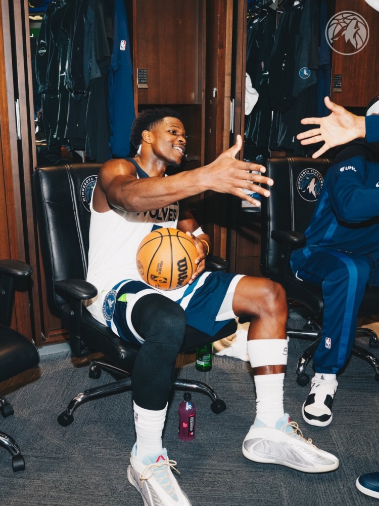 赛后,森林狼官方晒图,爱德华兹拿到本场比赛的用球。
